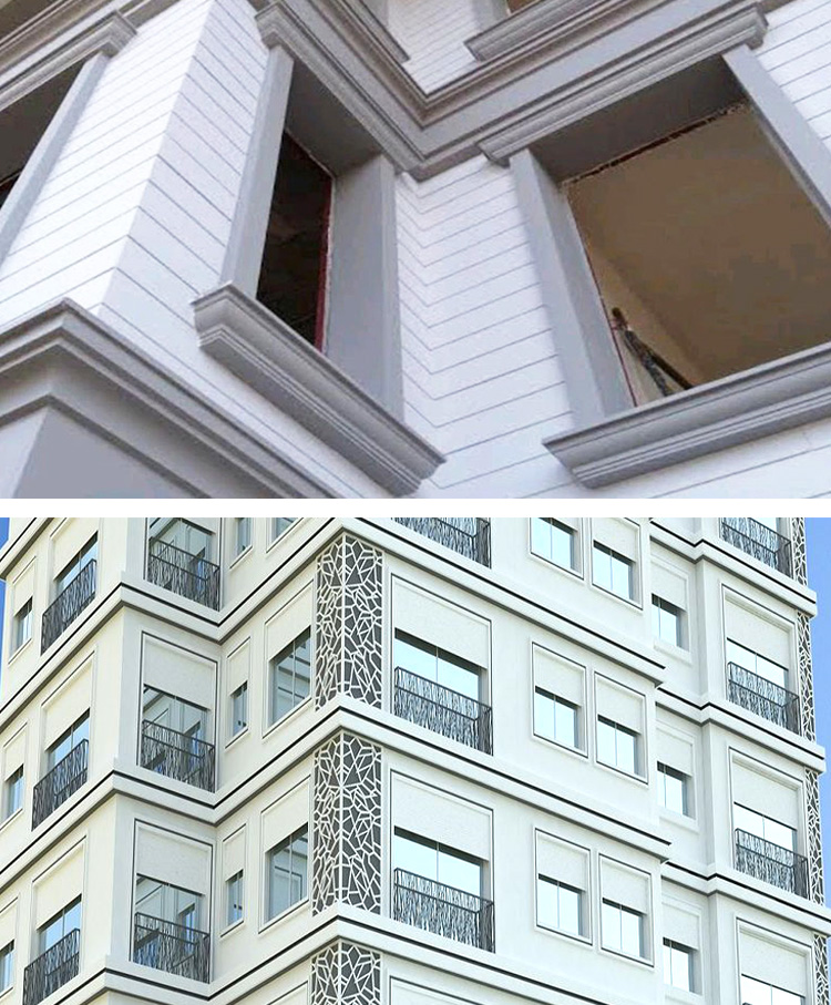 - Prekast Cam Elyaf & Fiber Takviyeli Beton (GRC & GFRC): Cam elyafı ile takviye edilen betonlar, hafiflik ve dayanıklılık sağlar. Bu tür cephe kaplamaları, farklı renk ve desenlerde üretilebilir, bu da tasarım esnekliği sunar.